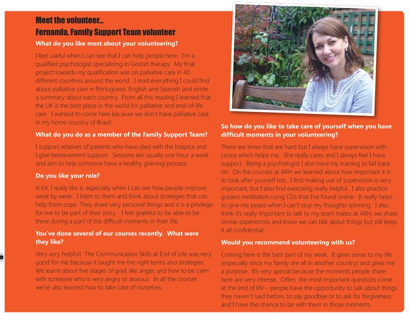 After studying the existential approach in psychology, I decided to research the literature on psychological interventions in palliative care, which resulted in my first publication (Melo, Valero, & Menezes, 2013). In the course of my research I came across an article about the quality of end-of-life care across the world (Mayor, 2010), and in a list of 40 countries, the best care was found to be in the United Kingdom, Australia and New Zealand. Then, in 2012 I moved to the United Kingdom (Cambridge) where I experienced working with patients in a hospice. To view my interview at the Arthur Rank Hospice’s magazine, click here.